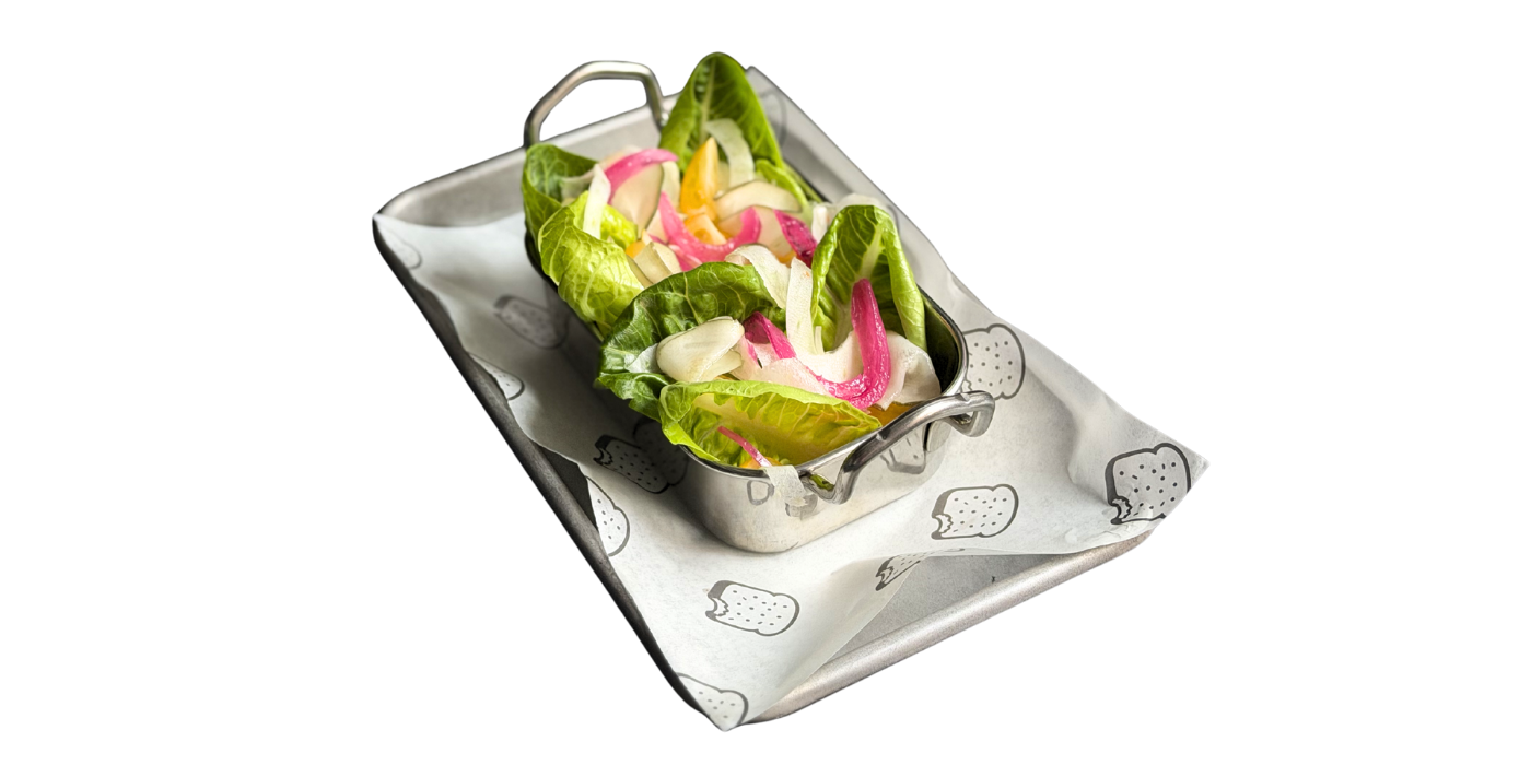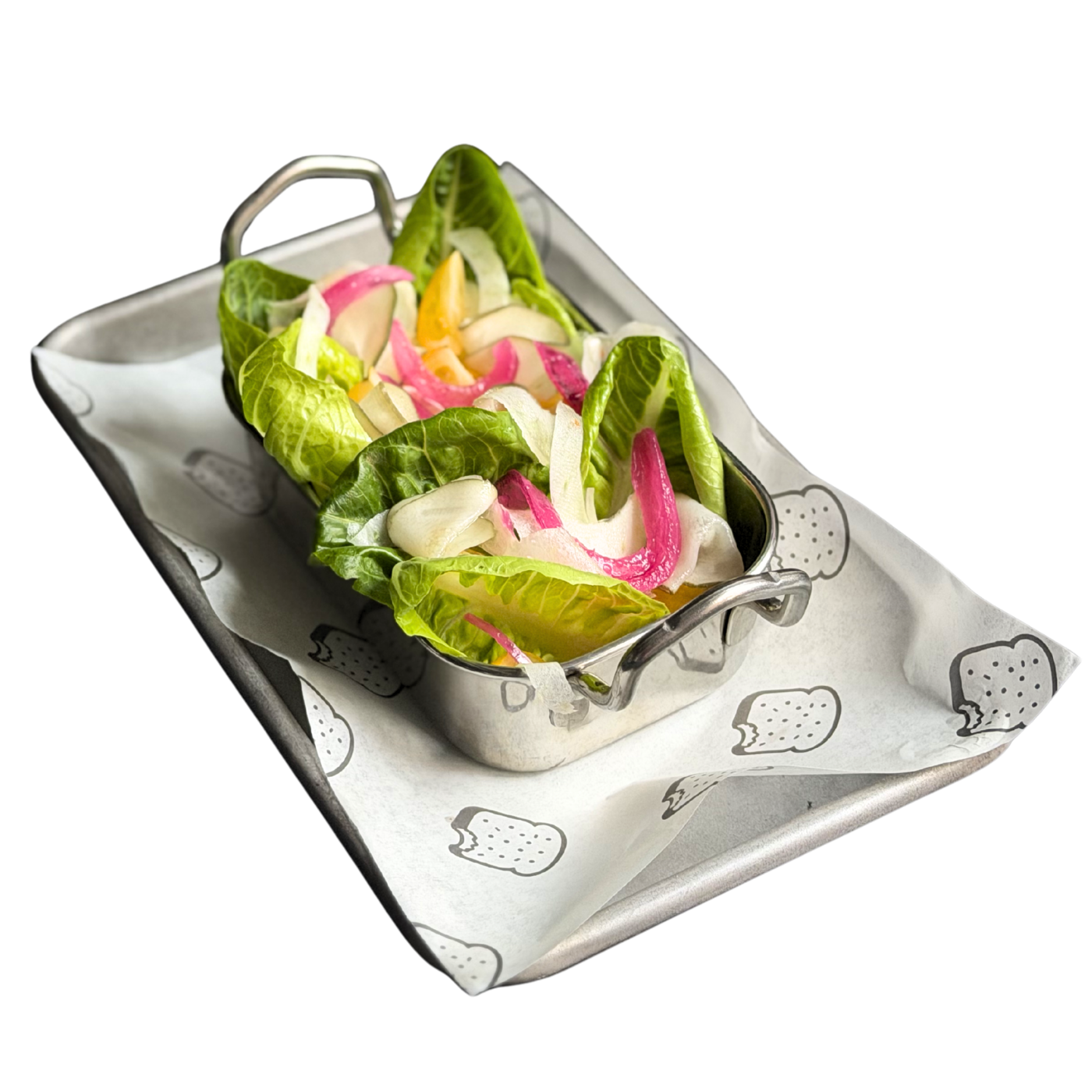 Gem lettuce, fennel, tomato and pickles with a sesame dressing