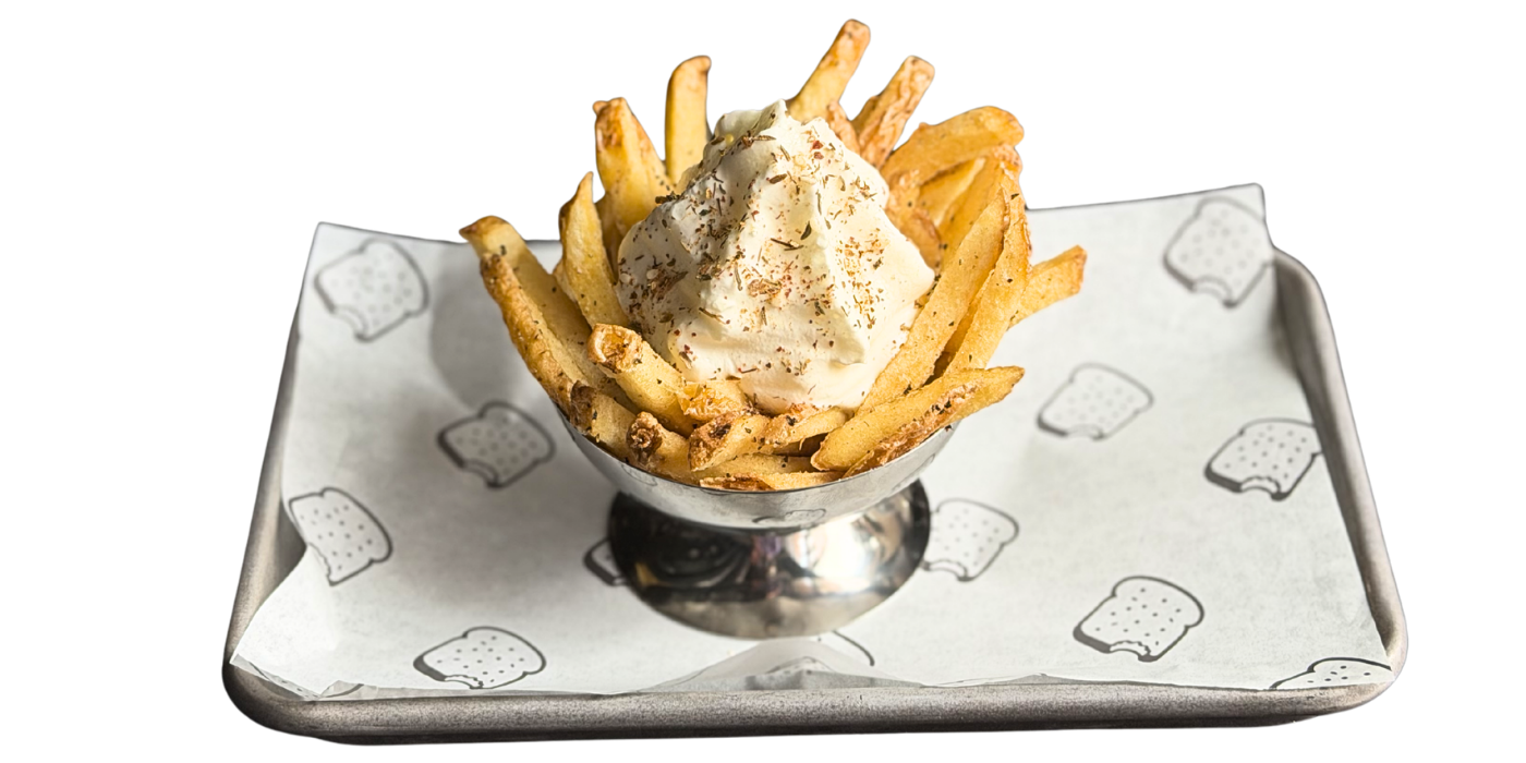Seasoned with salt, black pepper and garlic. Topped with smoked ox tail & burnt ends Texas chili. Sourcream and pickled onions